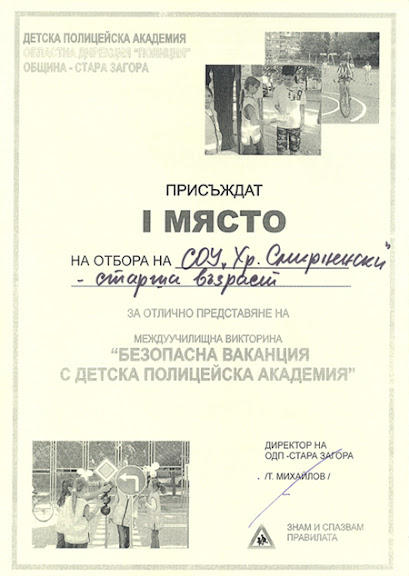 Детска полицейска академия е създадена през 2002 г. През 2005 г. се присъединяват две групи деца от начална степен от СОУ "Христо Смирненски" с ръководител Галина Петкова.